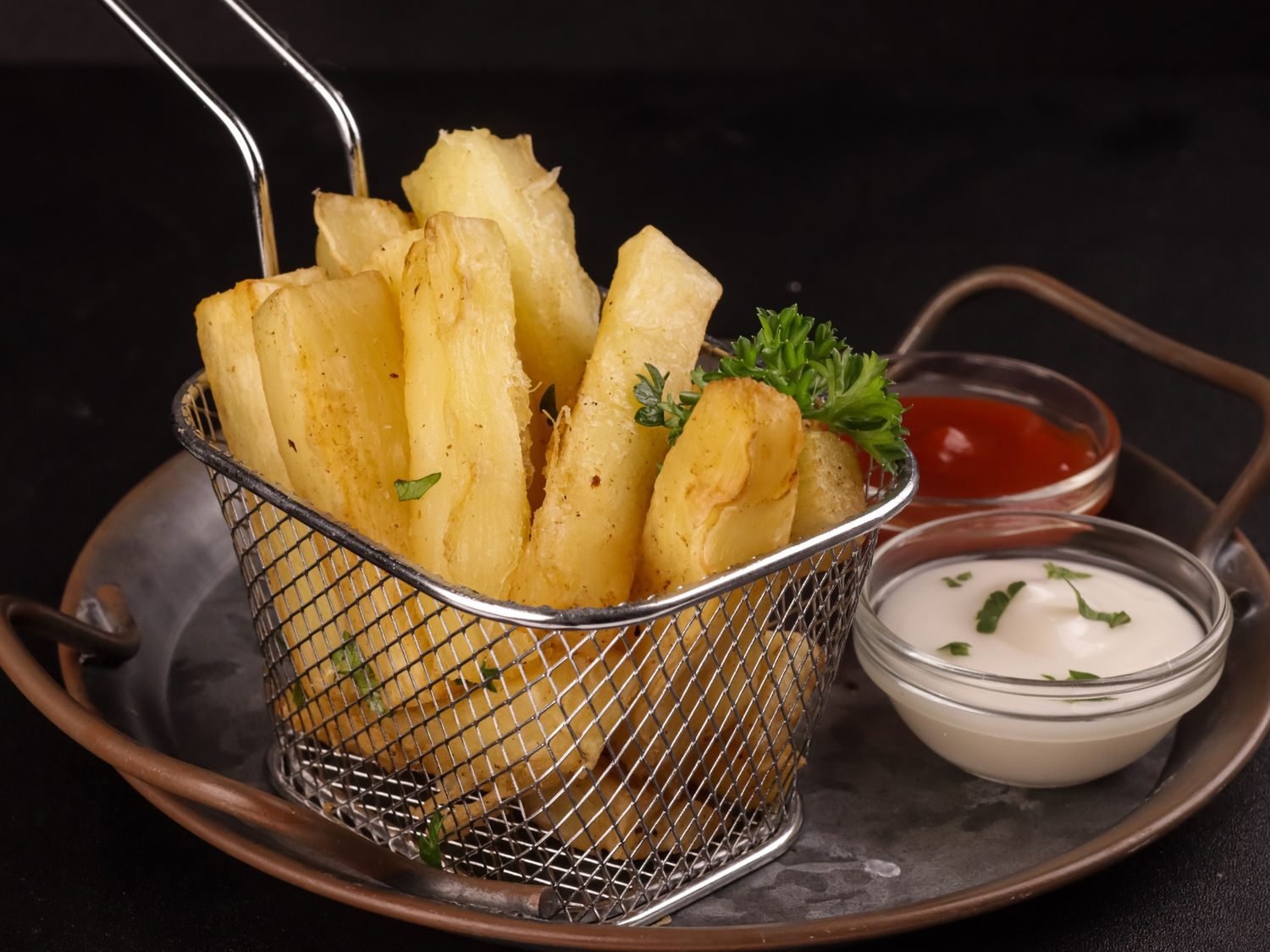 **Fried Cassava (Fried Yuca)** Our fried cassava is the perfect combination of crispy on the outside and soft on the inside. Rustic cuts of cassava root, fried to perfection, for a delicious and authentic side dish.